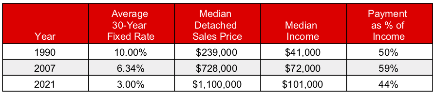 How is this possible, with home prices at such record high levels? The answer comes from two factors: first, during that same time period, the local median incomes have been consistently climbing while second, the interest rates on mortgages have been consistently falling.